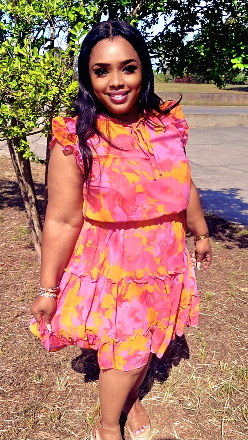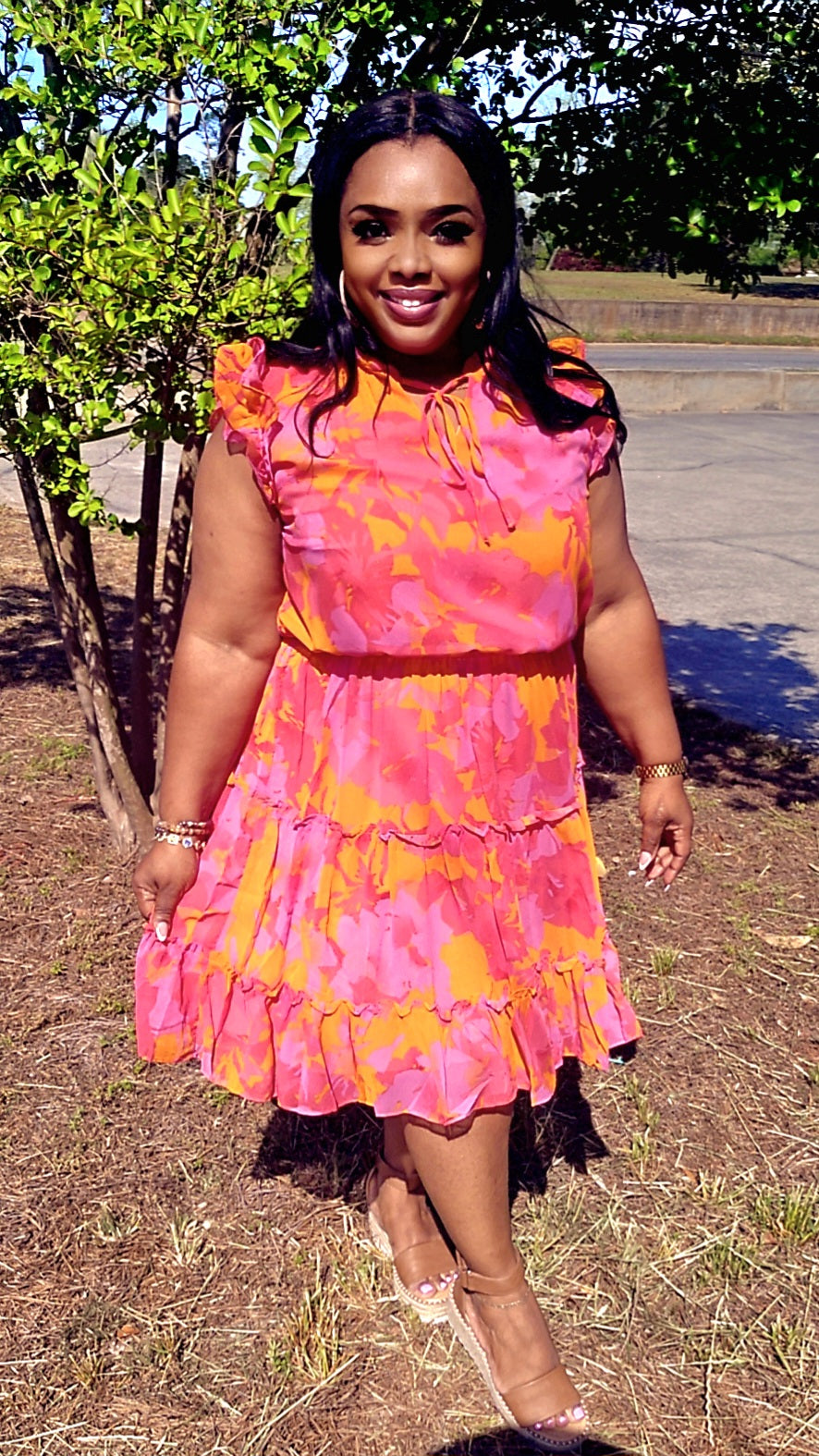 Lightweight printed chiffon-like woven with a soft, airy drape V-neckline with visible tie detail at the front Double ruffle cap sleeves for a dressed-up finish Elastic waist with a relaxed, blouson-style bodice Tiered mini skirt with ruffle trim for easy movement Bright pink + orange floral print that pops for spring/resort moments