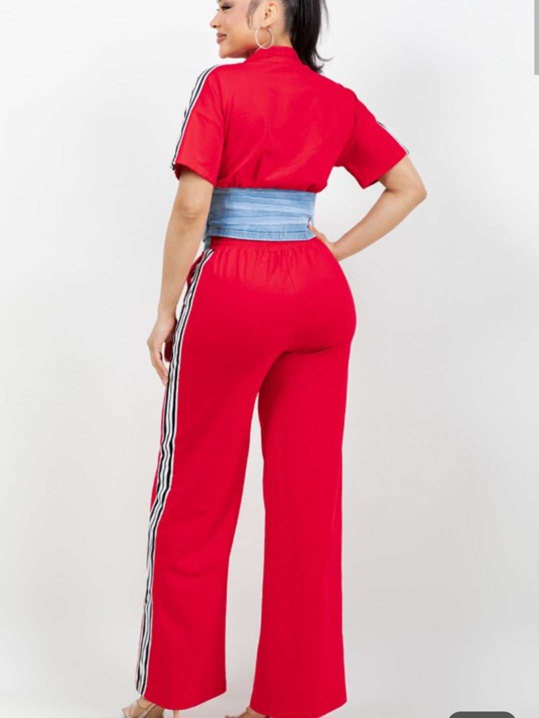 Two-piece denim set with striped, zipper front and wide leg, drawstring elastic on back waist, cotton stretchable suit for everyday wear, Model is 5'7" size 4, wearing samples size S